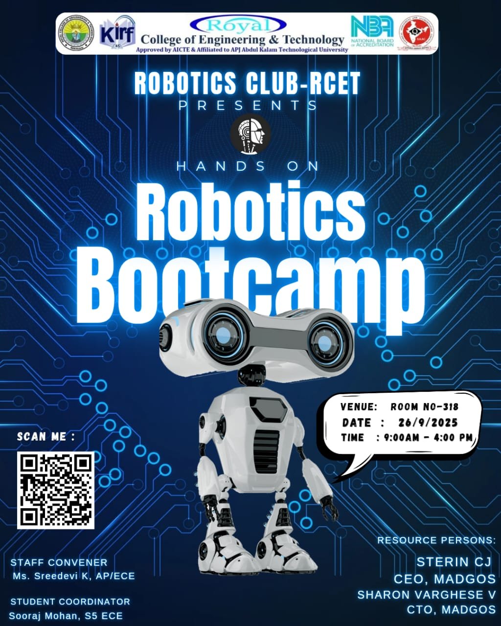 The Robotics Club-RCET successfully conducted the “Hands On Robotics Bootcamp” on 26/9/2025 from 9:00 AM to 4:00 PM in Room No-318. The resource persons, Sterin CJ (CEO, MADGOS) and Sharon Varghese V (CTO, MADGOS), led the bootcamp, providing hands-on experience in robotics.