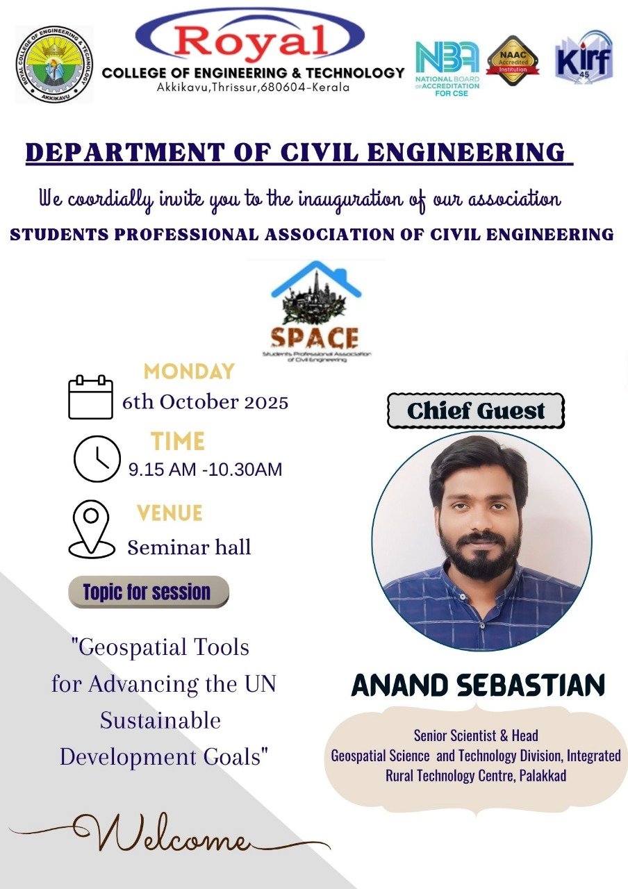 The Special Address was delivered by Dr. P. Suresh Venugopal, Principal, RCET inspiring students about importance of being skilled engineers in todays era. The session was officially inaugurated by Mr. Anand Sebastian, who inspired the students with insights into the field of Geospatial Science and Technology, emphasizing its importance in the civil engineering domain.
